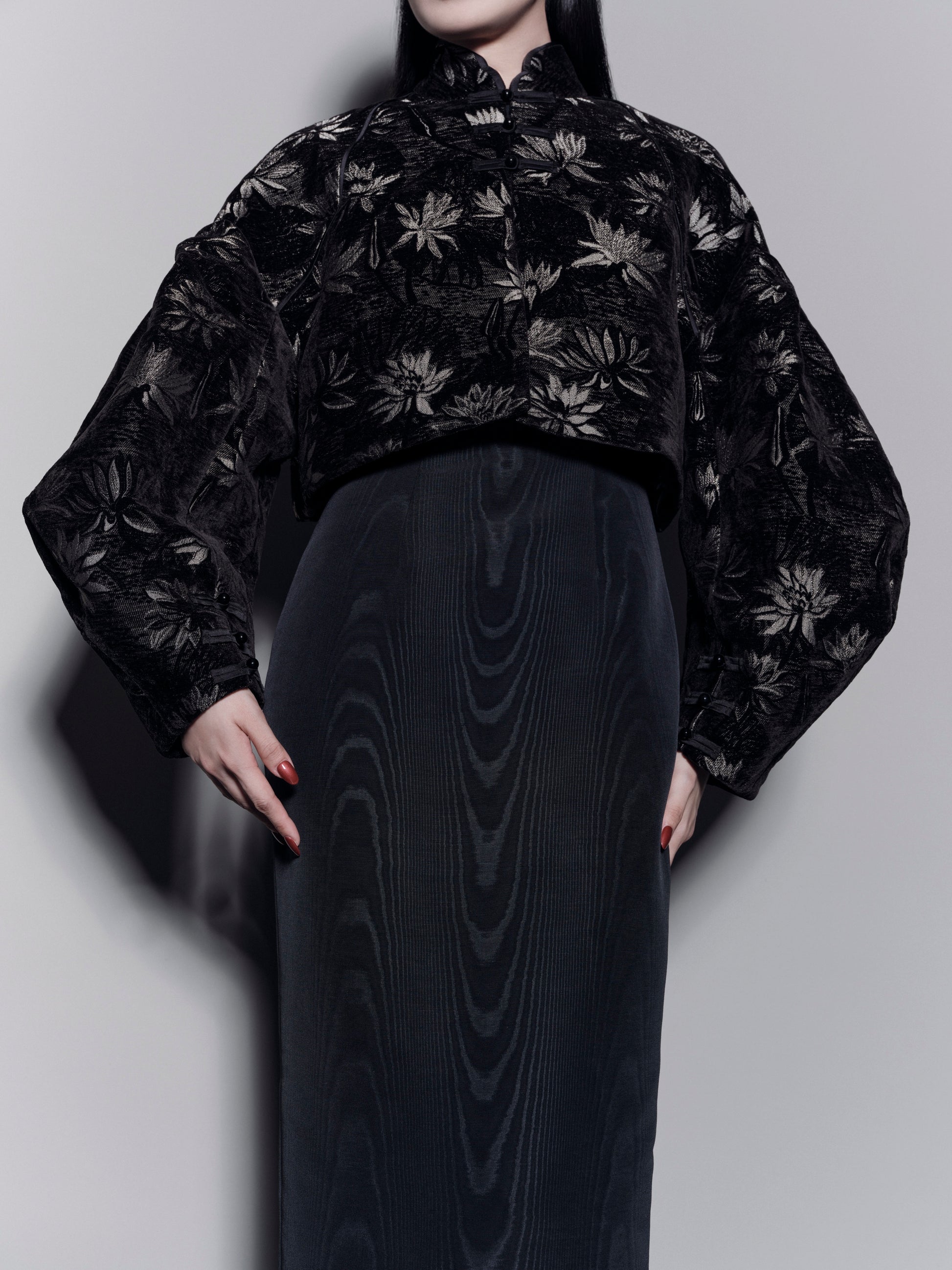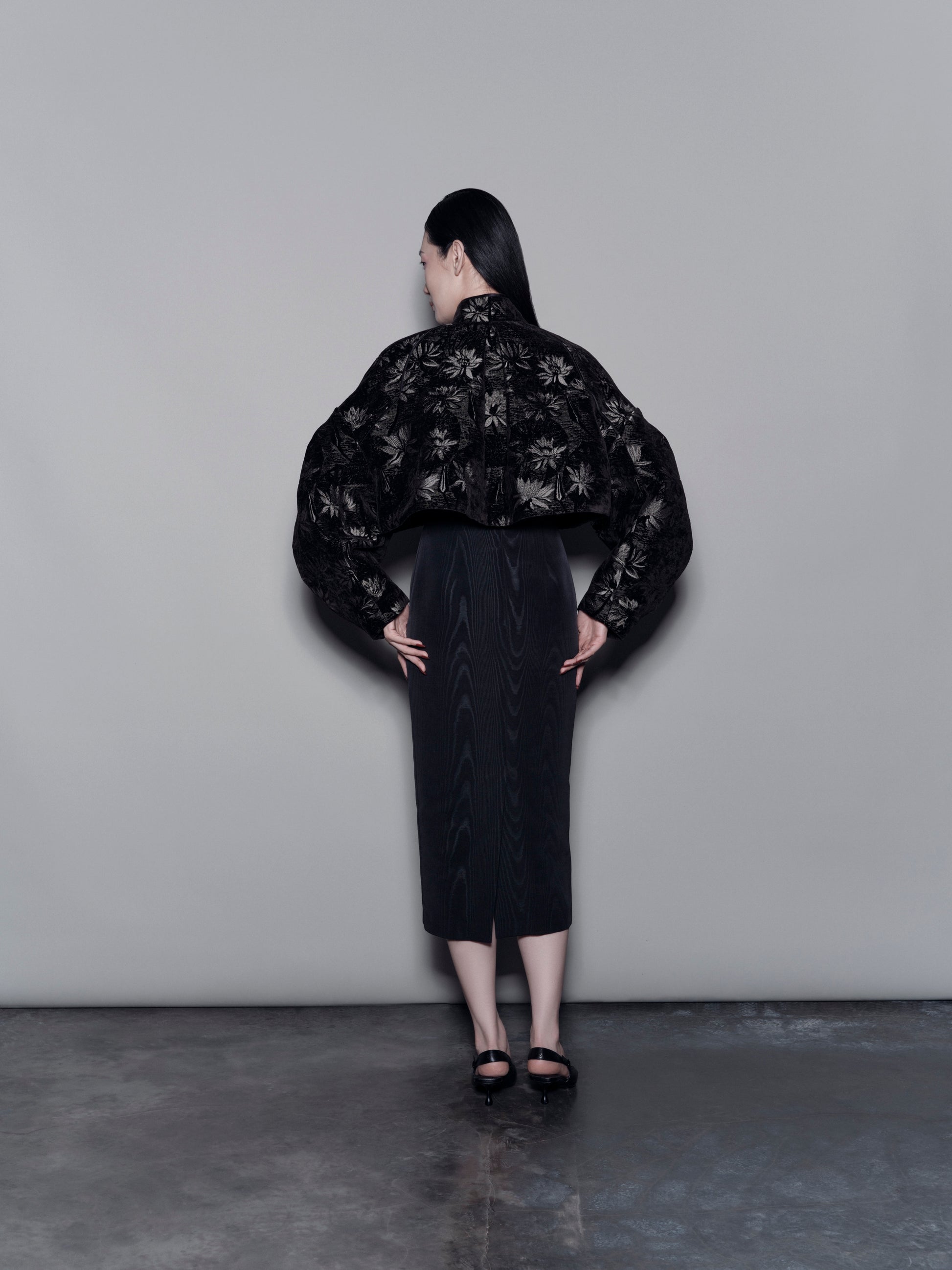 A cropped jacket featuring a scalloped mandarin collar accented with black piping. Designed with softly puffed sleeves finished with buttoned hems, and a voluminous puff-back detail for a sculptural silhouette.