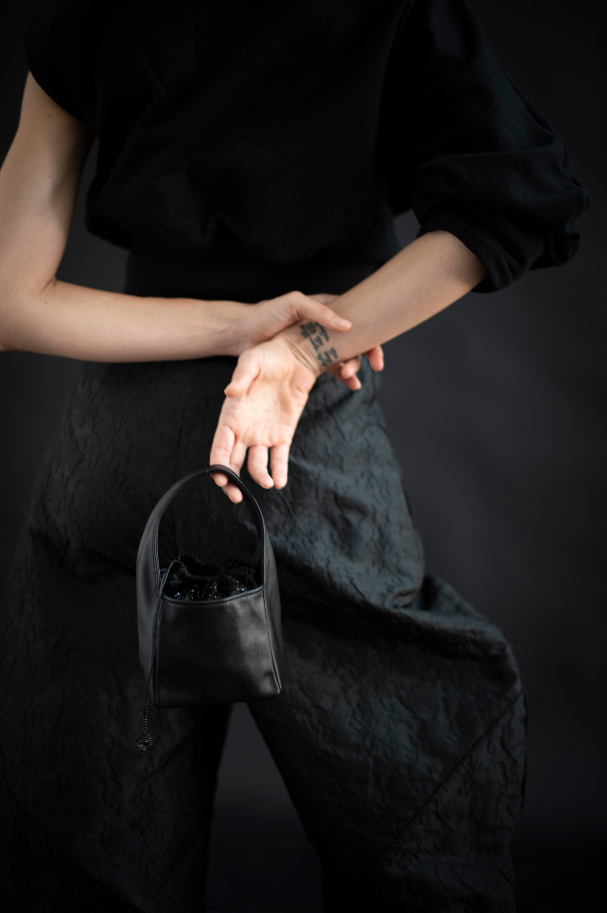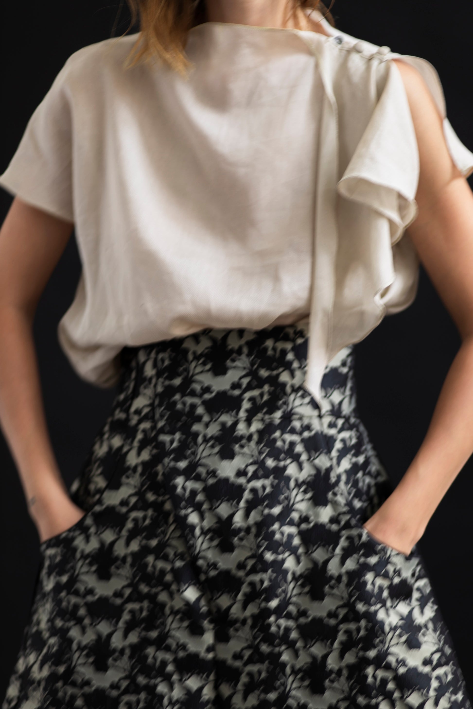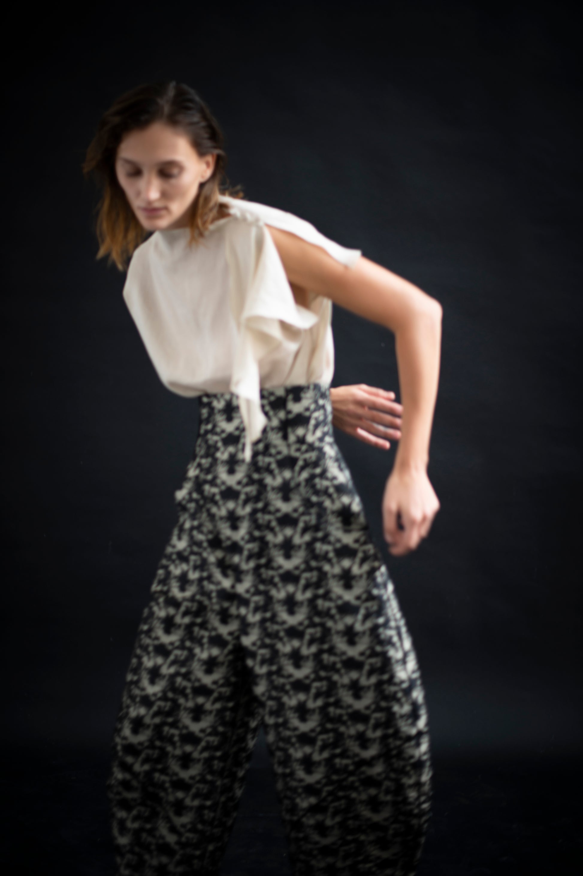 High-waisted pants crafted from our custom jacquard fabric, featuring an exaggerated barrel-leg silhouette. Finished with elegant satin piped seams for a polished touch.