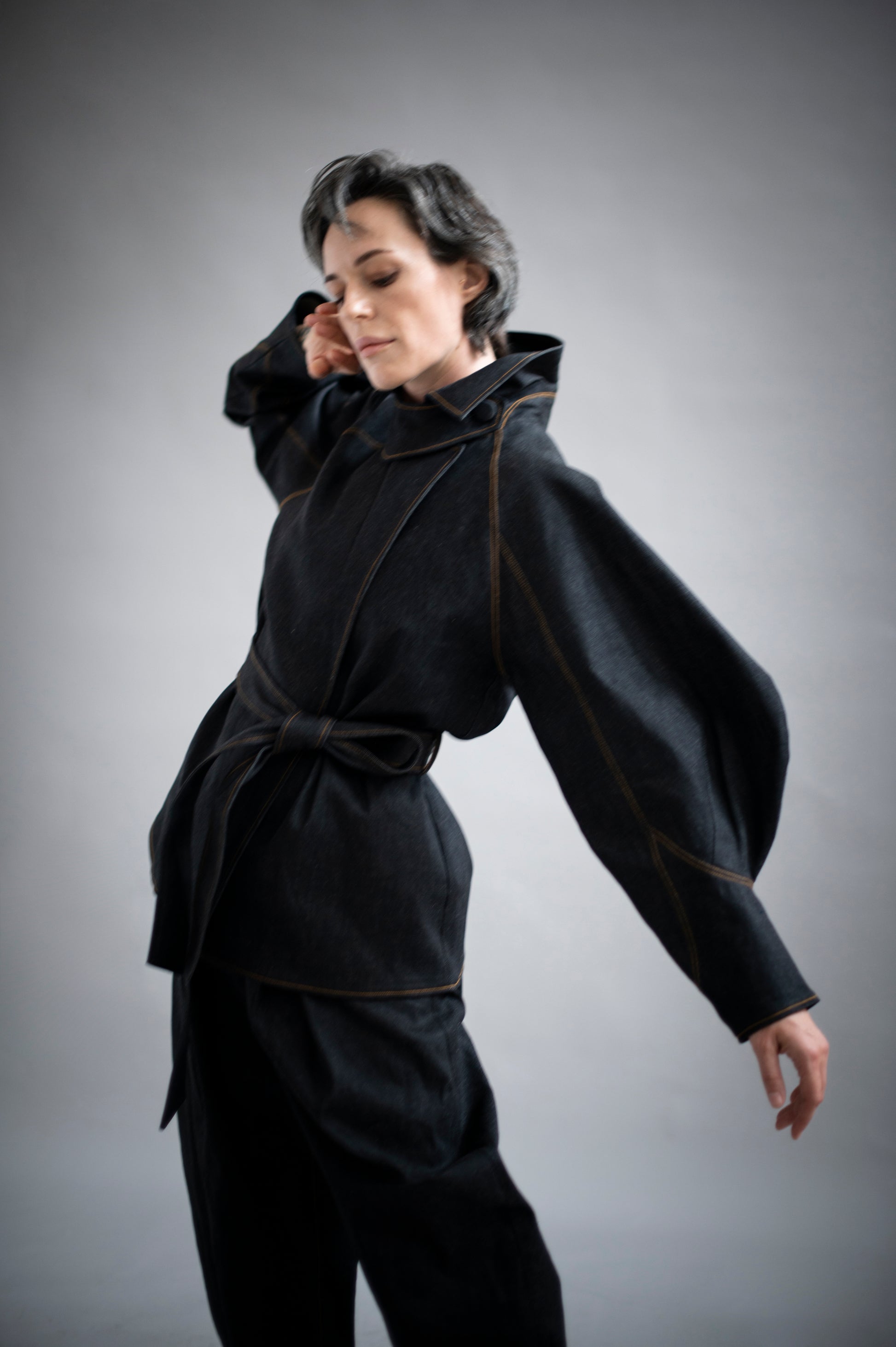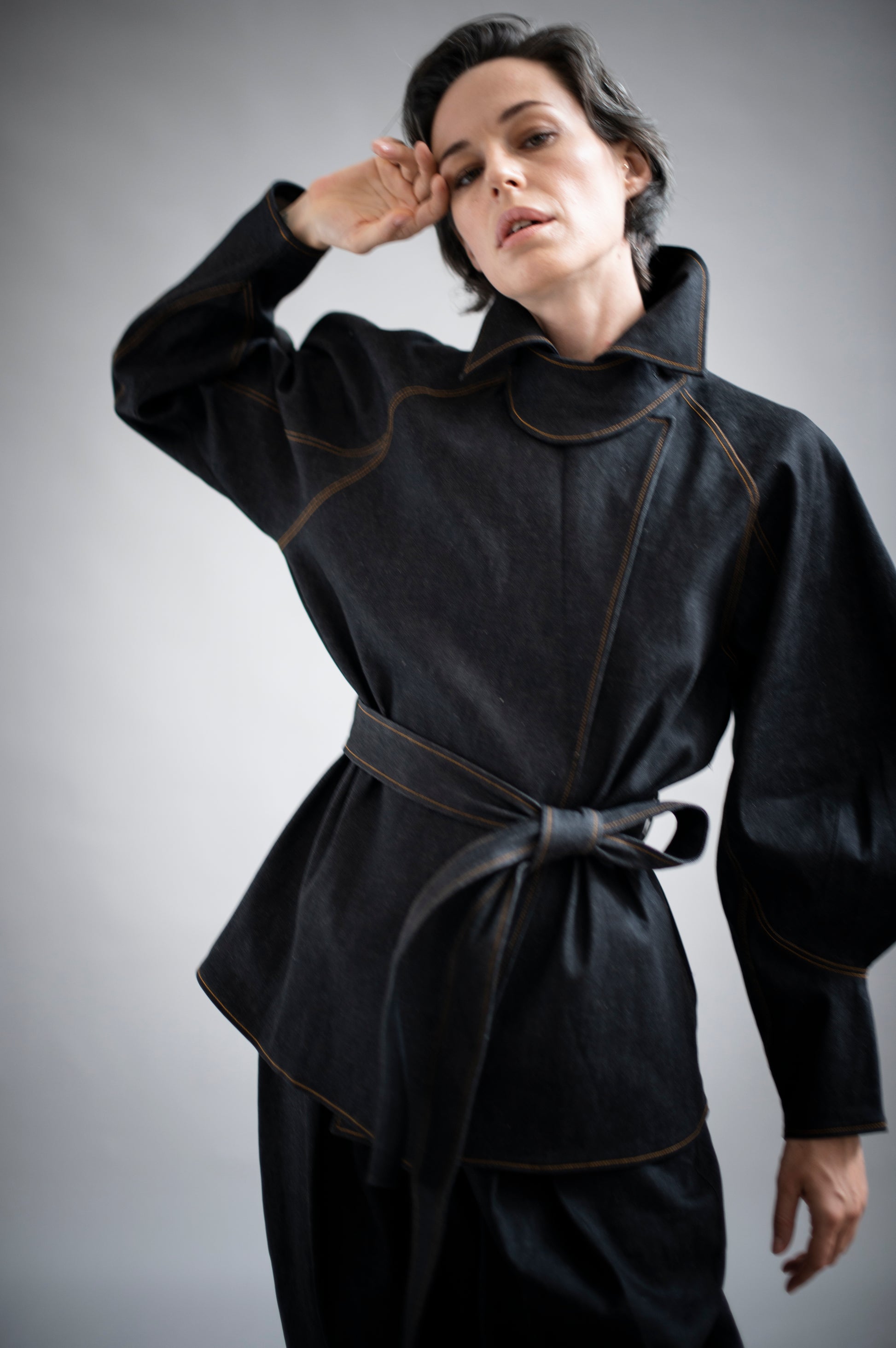 Our denim jacket is designed to elevate your casual days with style and ease. Wear it fully buttoned, open with folded lapels, or fasten it using the unique collar panel—there are multiple ways to make it yours. Featuring balloon sleeves and a matching belt for a cinched waist, it’s a versatile piece you’ll reach for again and again.