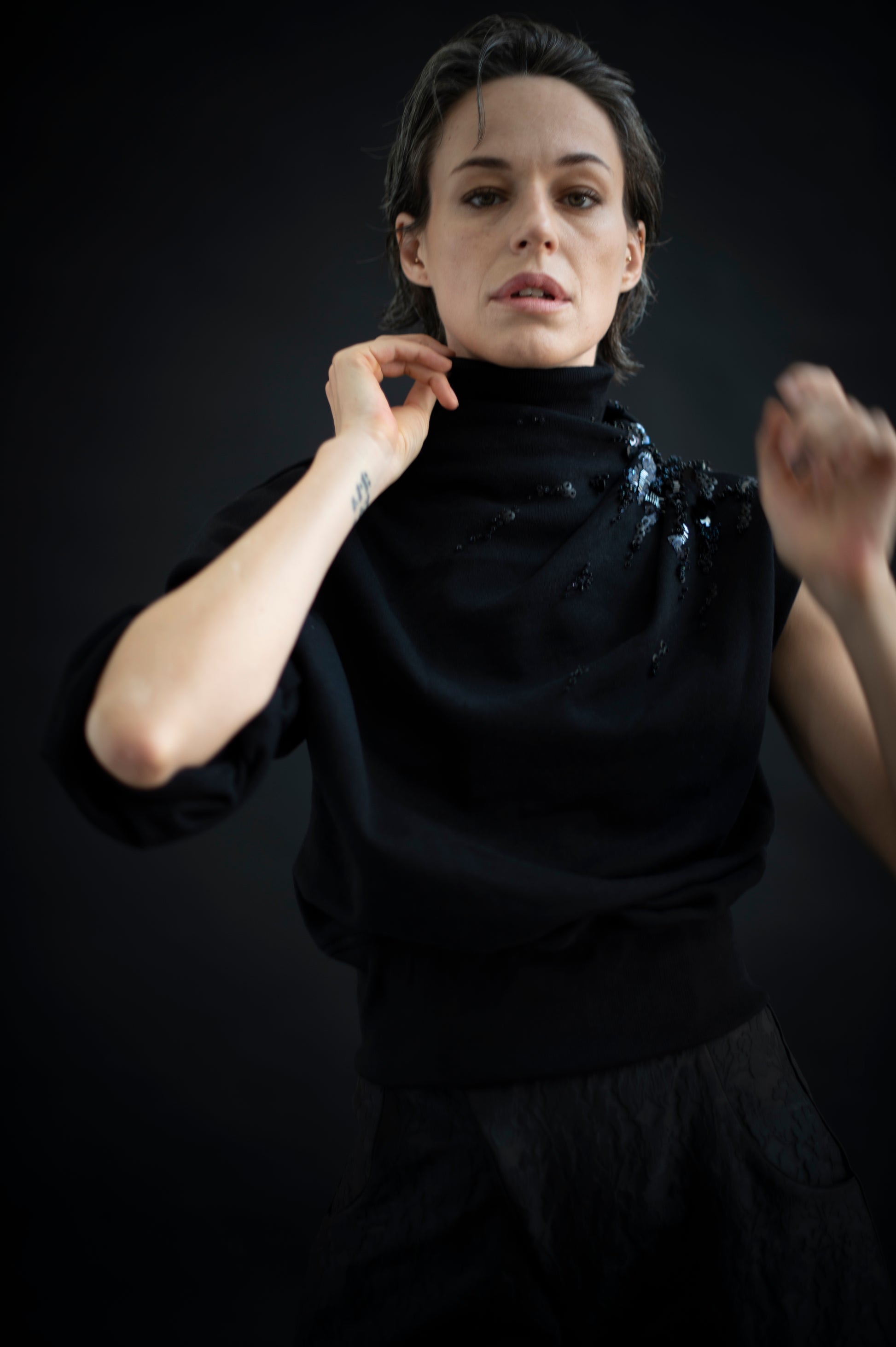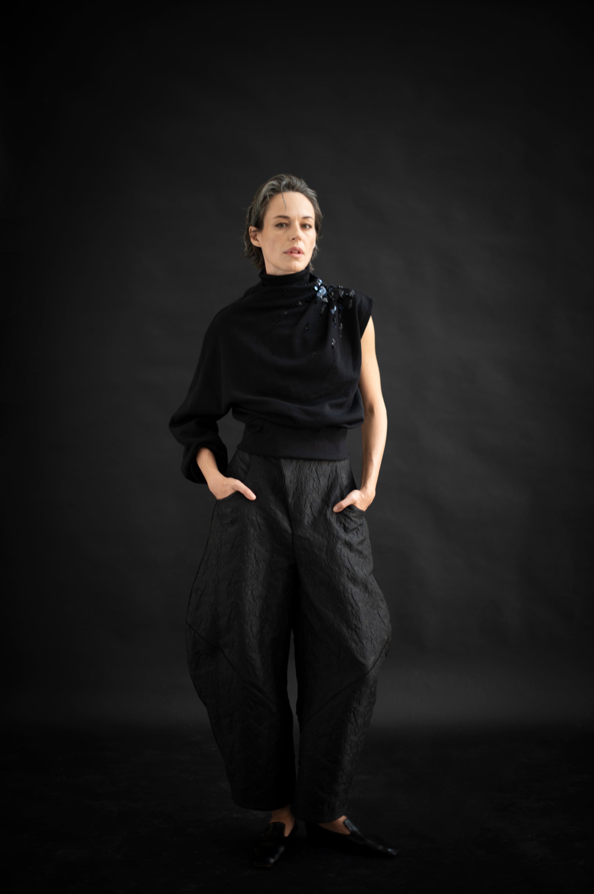 Inspired by the classic knit, this sweater features a modern twist with a draped high neck and a one-sided sleeve design. Finished with delicate hand-beaded detailing, it’s a unique statement piece that blends comfort with elevated craftsmanship.