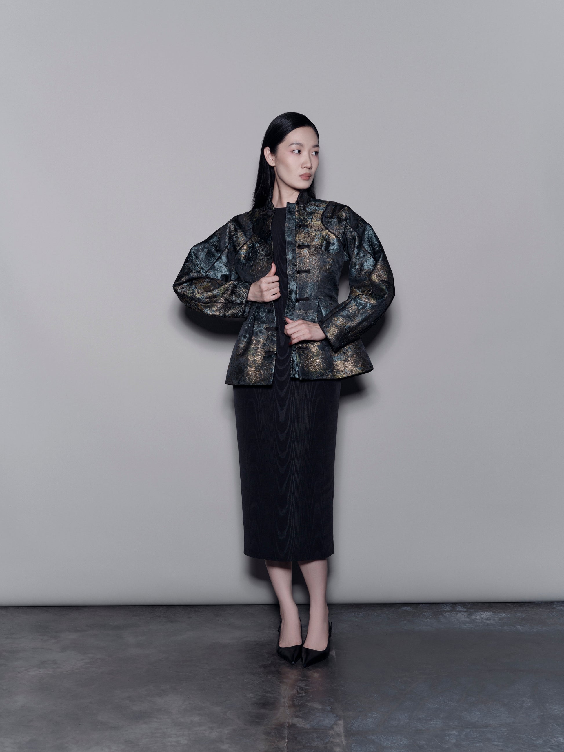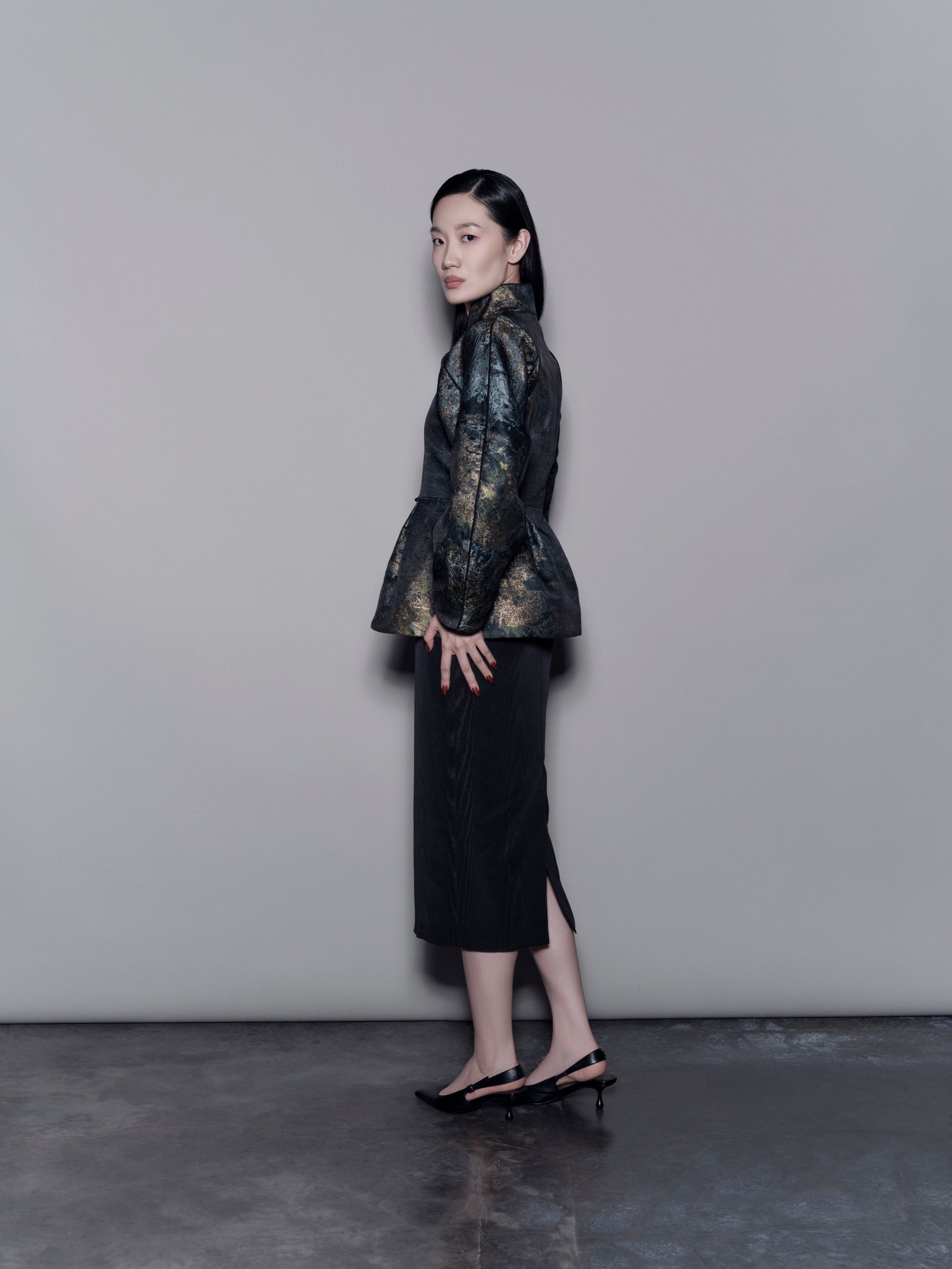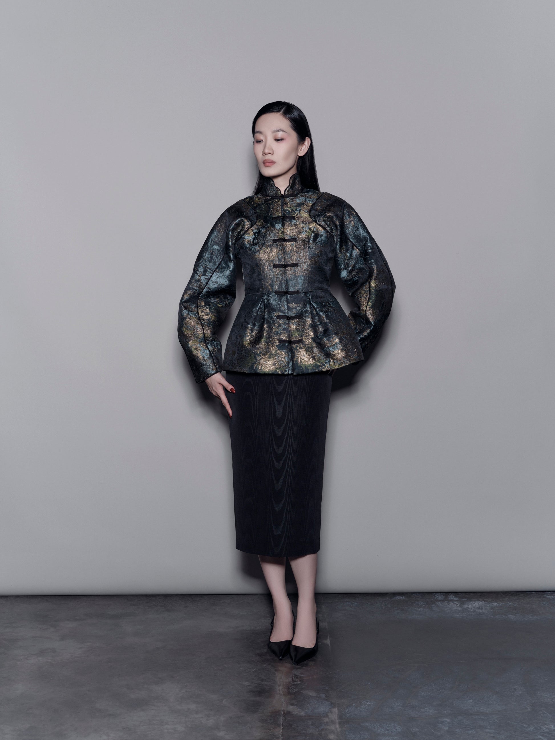 A sophisticated mandarin collar jacket featuring a unique raglan cut and voluminous sleeves. The cinched waist creates a subtle peplum silhouette, lending structure and feminine elegance.