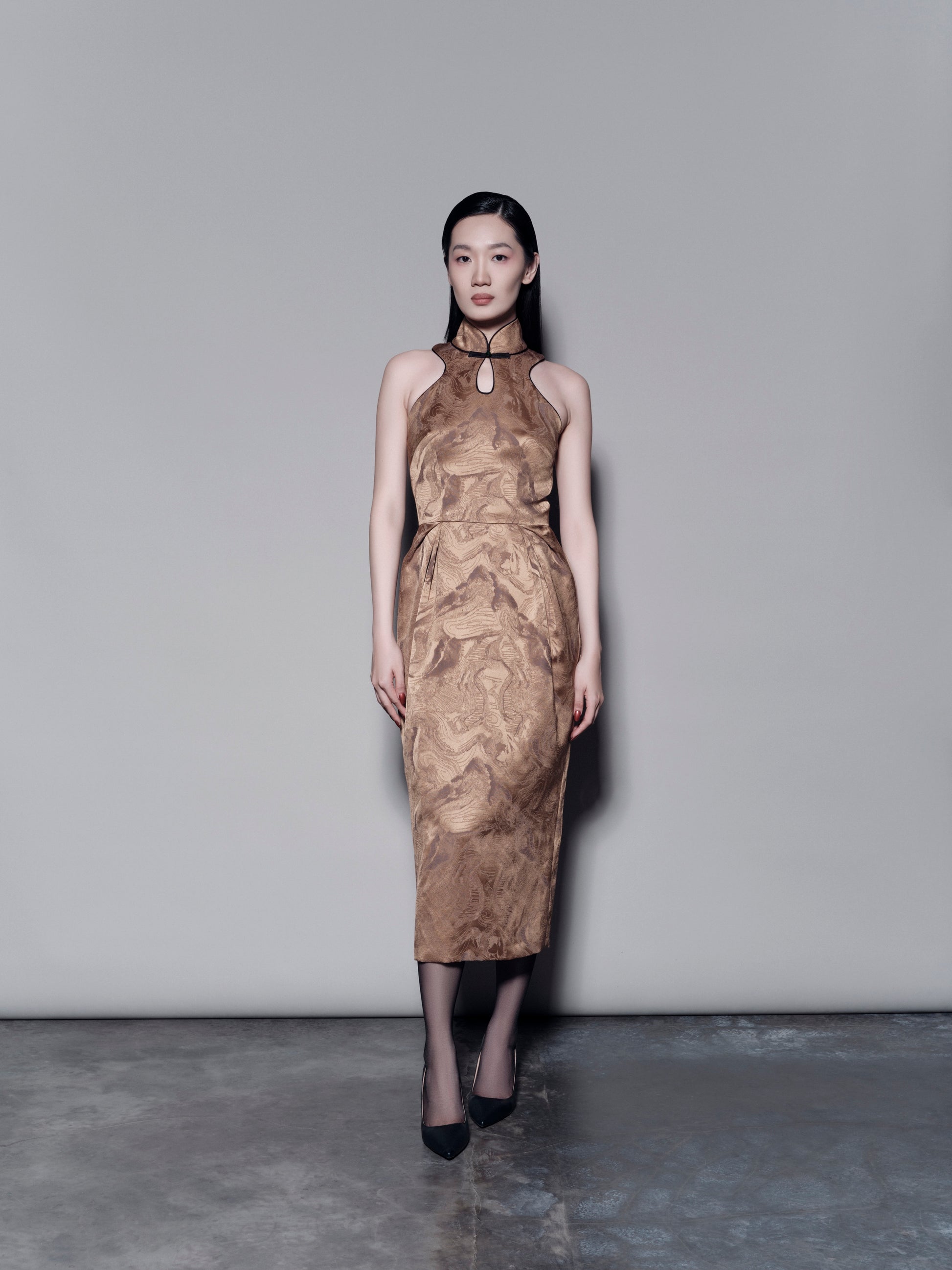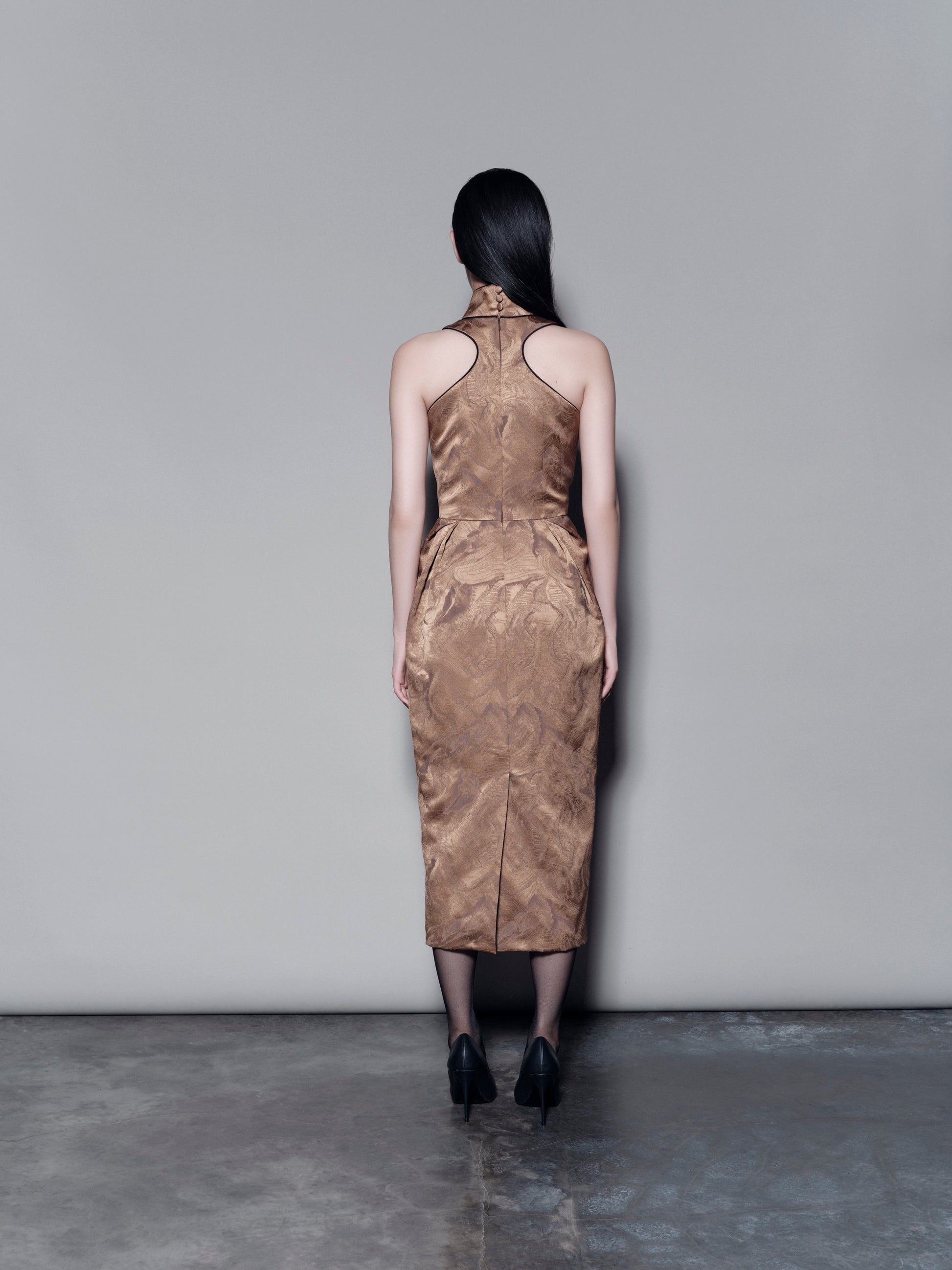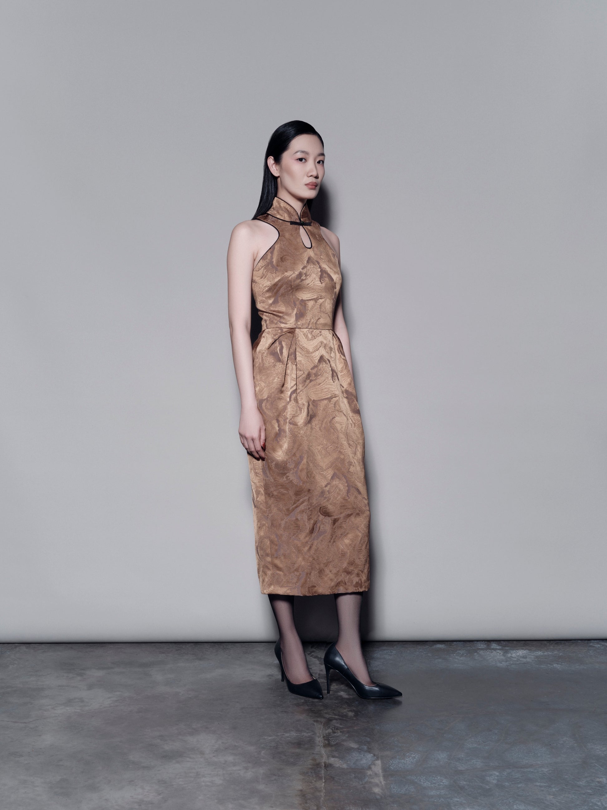 A unique halter-neck mandarin collar dress featuring a subtle chest cut-out. Designed with a cinched waist and delicate draped detailing, it offers a classic yet refined silhouette.
