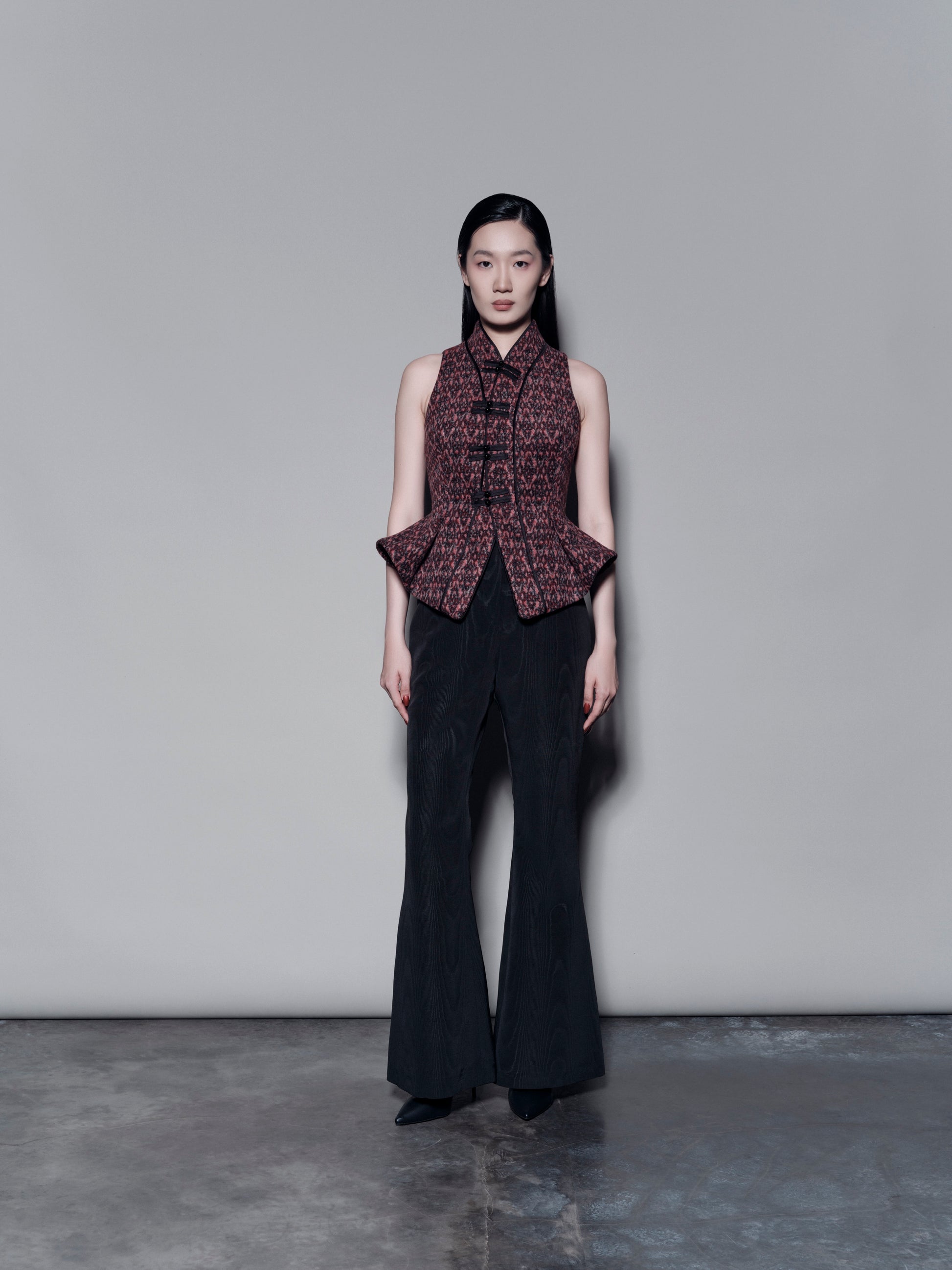 A high-collar top featuring center-front button detailing accented with refined piping. Designed with a cinched waist that creates a subtle peplum silhouette for a structured yet feminine look.